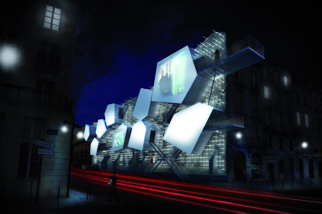 Jouant des particularités d’un mur aveugle sur les quais de la Garonne à Bordeaux, cette galerie se compose de multiples capsules greffées à la paroi. Chacune d’entre elles renferme les pièces de l’exposition. La découverte des œuvres se déroule selon un parcours entre les différents espaces. Des projections nocturnes, et des tubes de plexiglas lumineux s’ajoutent à ce dispositif afin d’animer la façade, la nuit tombée.