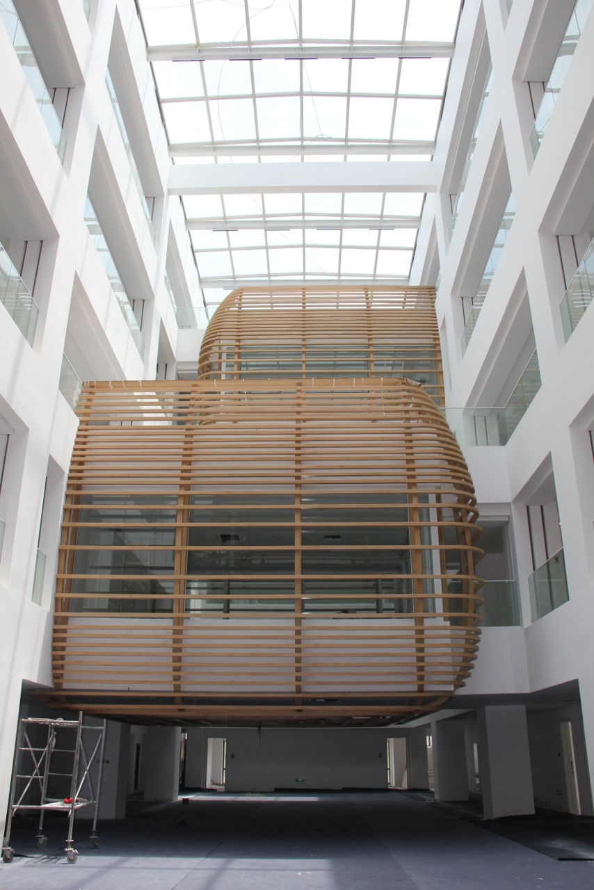 L’Université Eurasia de Xi’an en Chine, cherche à se développer. La collaboration avec l’Agence Blond & Roux Architectes pour l’aménagement d’un bâtiment administratif de 7 000 m² est un premier pas dans leur volonté de se tourner vers l’Europe. Sur cinq niveaux, autour d’un atrium central, une coursive dessert les différents bureaux administratifs. Trois « boîtes » suspendues font office de salles de réunion. Elles sont au cœur de l’espace, conçues comme des nids en bois, laissant à la fois traverser la lumière tout en se préservant des regards.