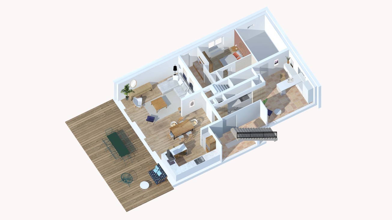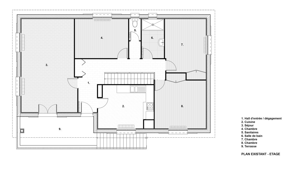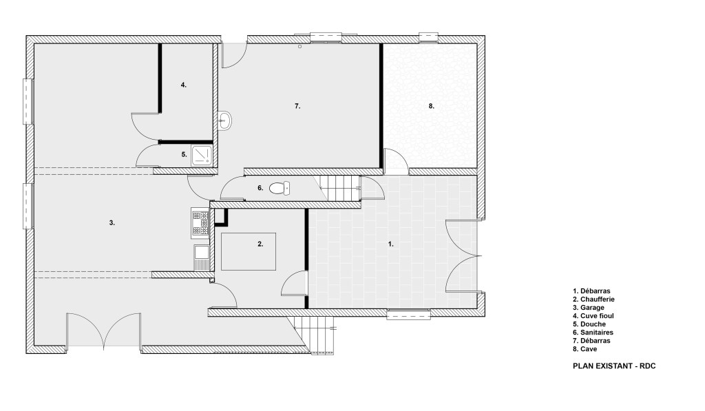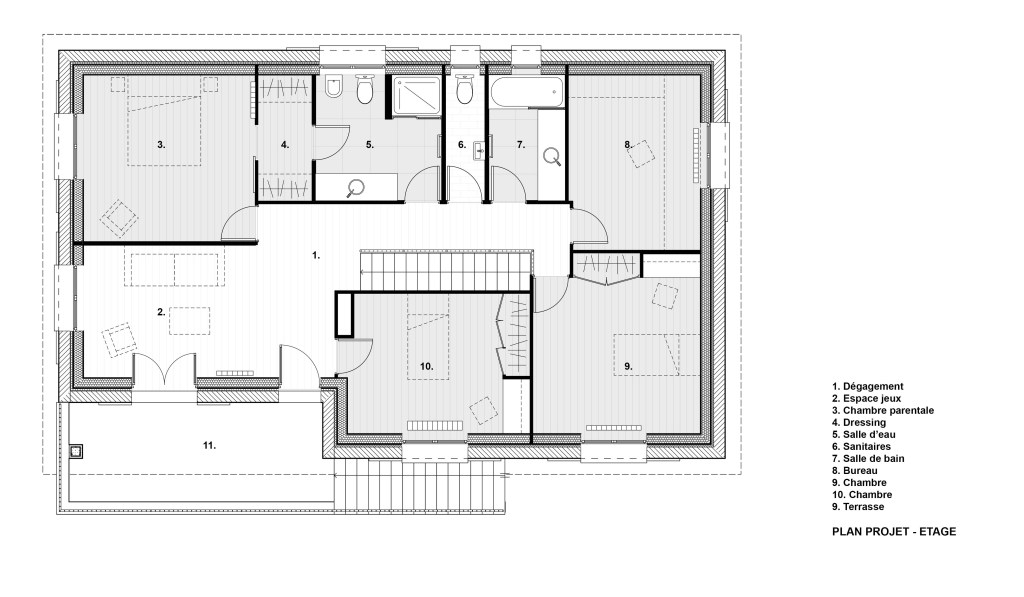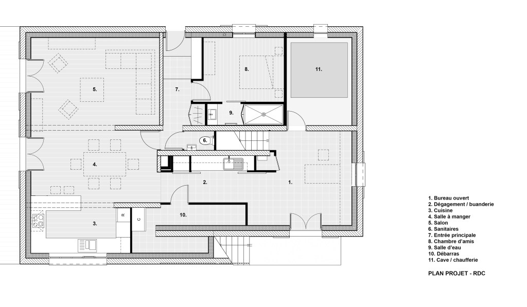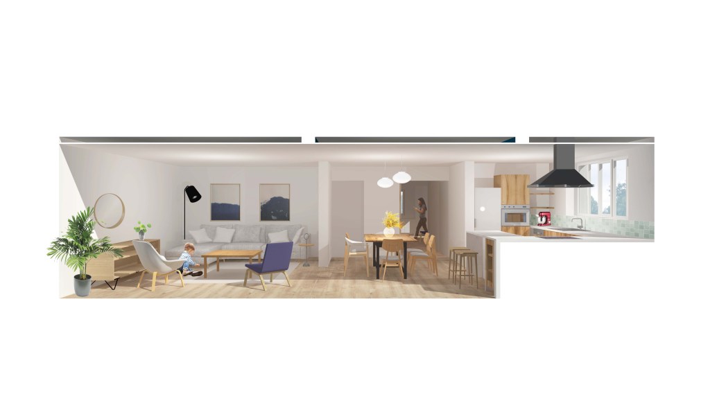 Après des années passées en région parisienne, N. et C., posent leurs bagages dans ce petit village. Ils jettent leur dévolu sur une maison typique des années 70 pour s’installer en famille. Si l’immense jardin ne demande aucune modification particulière, l’intérieur de la maison est quant à lui resté dans son jus, et mérite un grand chamboulement. Le rez-de-chaussée, autrefois garage et local technique, est entièrement remanié pour devenir un espace de vie, une cuisine, une buanderie, et une chambre d’amis. L’ensemble est tourné vers l’extérieur pour profiter enfin de la vue, et de l’accès direct au jardin. L’étage est remodelé, recloisonné afin de créer une salle de bain supplémentaire, un bureau, une chambre et un espace de jeu pour les enfants.