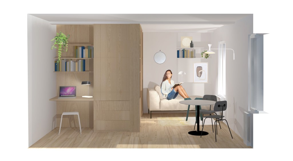 Un ensemble menuisé sur mesure est conçu autour de l’espace nuit, comprenant un coin bureau, un placard penderie, et une bibliothèque. Pour créer de l’intimité, un claustra coulissant peut refermer le volume, tout en laissant passer la lumière naturelle.