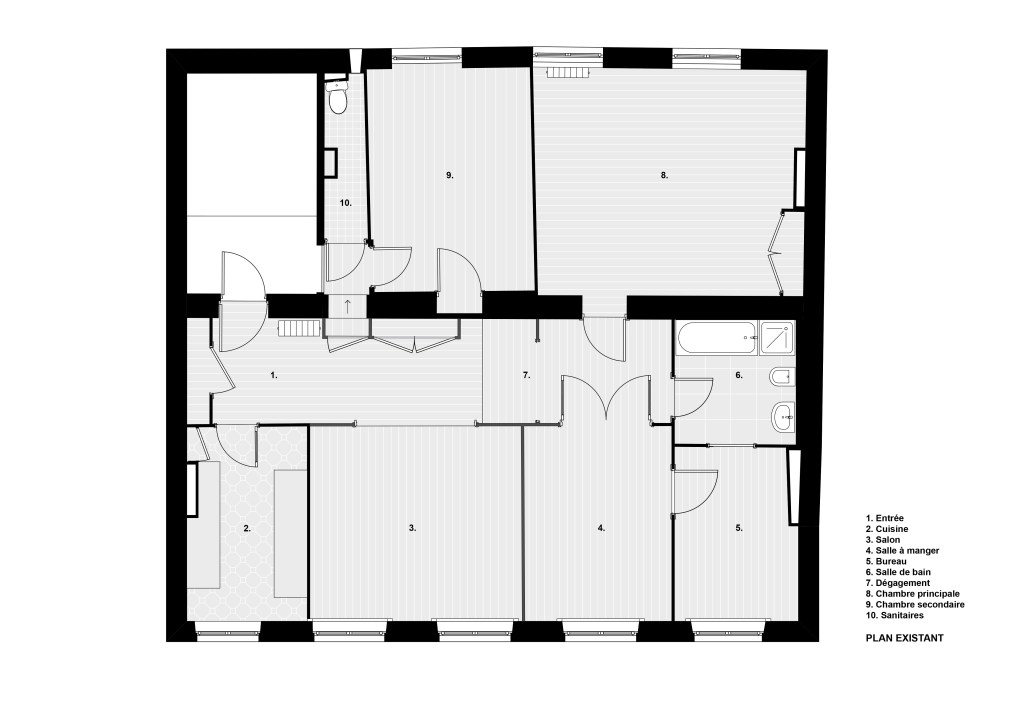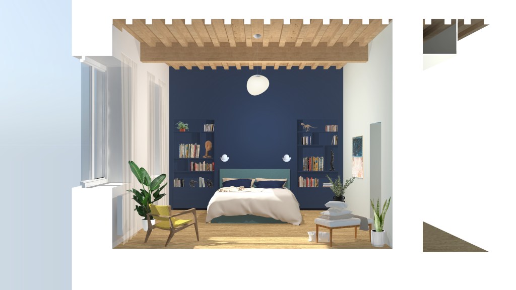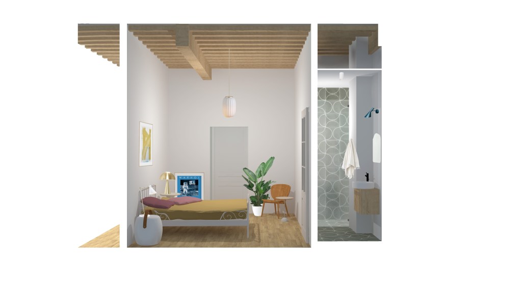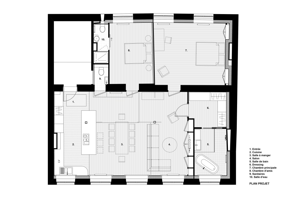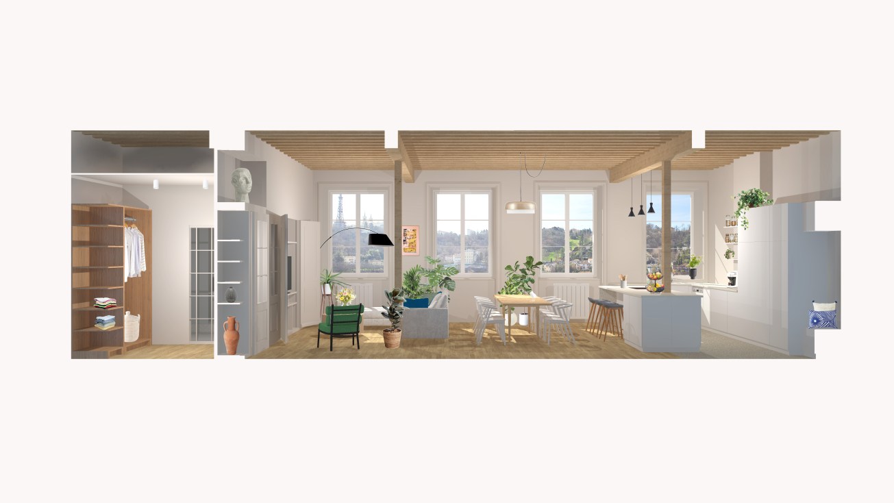 L’espace est entièrement décloisonné afin de créer un grand espace de vie, avec plafond à la française, regroupant une entrée, une cuisine autour d’un îlot central, une salle à manger et un salon, exposés au sud. Tout comme la salle d’eau royale, avec sa douche à l’italienne et sa baignoire îlot, vue sur le paysage. Les deux chambres sont logées, au calme, en retrait de la rue. Dans la chambre principale de plus de 20 m² est conçue une tête de lit bibliothèque pour contenir la collection de bande dessinée. Une chambre d’amis, avec une salle d’eau privative, vient compléter l’aménagement.
