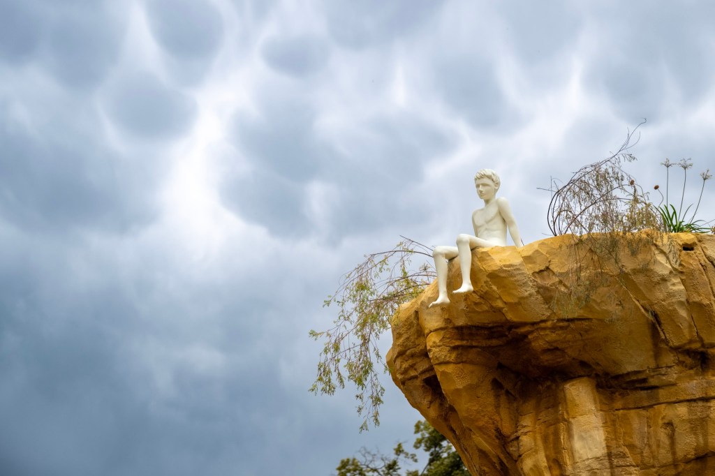 Les œuvres d’art exposées sur le territoire ont pour thématique l’anthropocène, une raison supplémentaire d’avoir une démarche éco-responsable et frugale dans notre approche. L’ensemble de la scénographie est donc pensée à partir de matériaux de seconde main et de réemploi : tasseaux et panneaux de bois issus d’une scénographie d’exposition, peinture issue de fin de stock, textile et cordelette issus de stocks dormants. Pour avoir un impact moindre sur le site, la signalétique est fixée avec des sangles à des plots béton posés au sol. Ces plots sont loués pour l’occasion.