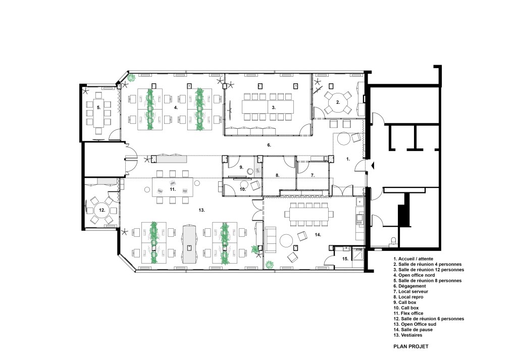 Pour conserver un certain degré d’intimité, les bureaux sont séparés par des bacs fabriqués à partir de bois déclassés par les apprentis de l’atelier d’insertion en menuiserie du Foyer Notre Dame des Sans Abris, et remplis de plantes, elles-mêmes issues de déconstruction, venues de la Société Protectrice des Végétaux.