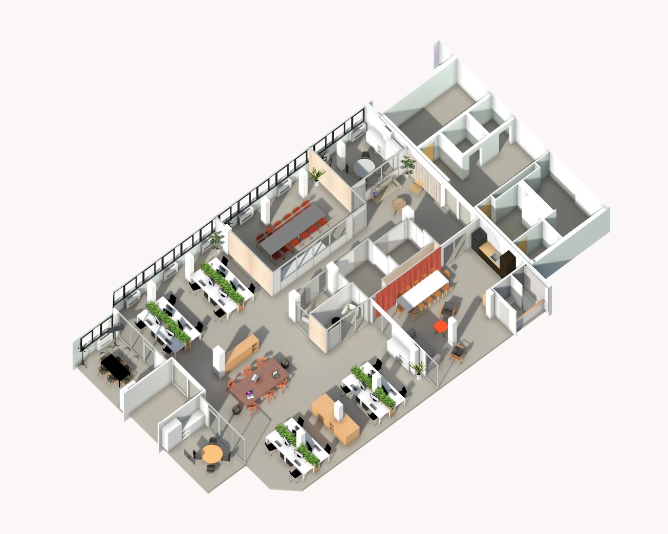 Avant travaux, le plateau est un plateau de bureaux classique, avec des espaces très cloisonnés au nord, et un grand open space au sud. L’aménagement est peu adapté à la manière de travailler des équipes actuelles. Les box vitrées au centre du volume et les cloisons au nord sont entièrement déposées pour créer trois nouveaux espaces distincts : un open space au nord, un flex office pour le travail des collaborateurs nomades au centre, et un open space au sud.